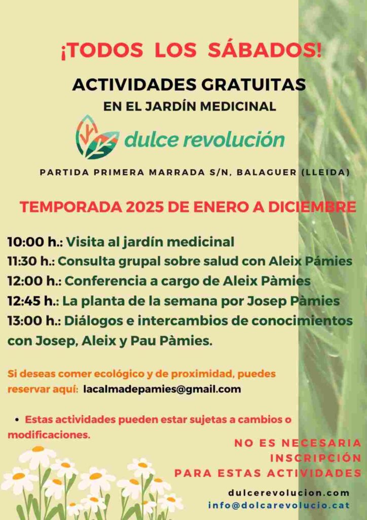 De 14:00 a 15:00 h en el Albergue la Calma de Pàmies, a 100 metros del Jardín Medicinal de Dulce Revolución, tenéis la posibilidad de comer el menú degustación de cocina medicinal ecológica y de proximidad.